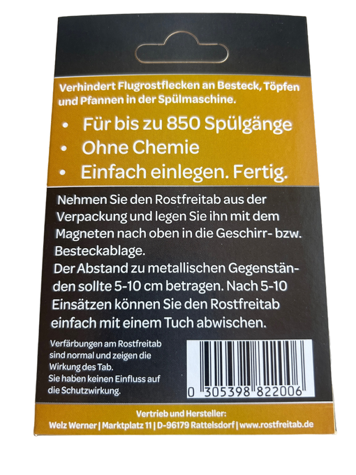 Die Neuerungen im Einzelnen sind folgende: Die verbesserte Magnetkraft ermöglicht es nun, dass ein einziger Magnet völlig ausreicht. Im Vergleich zu Konkurrenzprodukten haben wir die Magnetkraft sogar verdoppelt, wodurch eine verbesserte beidseitige Wirkung erzielt wurde. Der Durchmesser wurde leicht verkleinert, und die Dicke wurde reduziert, um eine handlichere Form zu schaffen. Gleichzeitig konnten wir die Produktion material- und kostenschonender gestalten. Die Schutzwirkung wurde durch zusätzliche Verfahrensschritte weiter verbessert, und die Nutzungsdauer von etwa 850 Spülungen konnte beibehalten werden. Sowohl wir als auch viele unserer Kunden, die bereits die vorherige Version des Rostfreitabs verwendet haben, sind begeistert von der neuen Handlichkeit und Wirksamkeit. Insgesamt haben wir somit für jeden das Beste erreicht.